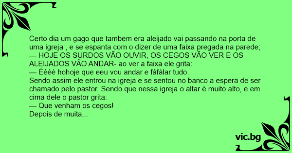 Certo dia um gago que tambem era aleijado vai passando na porta de uma igreja , e se espanta com o dizer de uma faixa pregada na parede;
