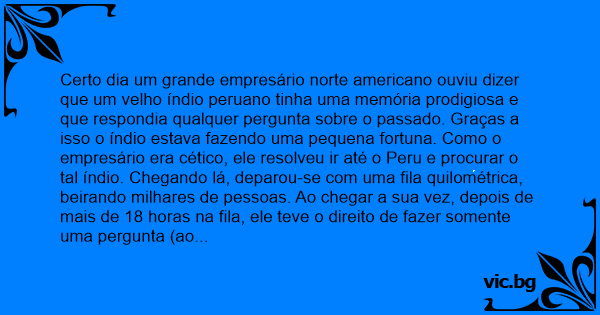 Certo dia um grande empresário norte americano ouviu dizer que um velho índio peruano tinha uma memória prodigiosa e que respondia qualquer pergunta sobre o passado. Graças a isso o índio estava fazendo uma pequena fortuna. Como o empresário era cético, ele resolveu ir até o Peru e procurar o tal índio. Chegando lá, deparou-se com uma fila quilométrica, beirando milhares de pessoas. Ao chegar a sua vez, depois de mais de 18 horas na fila, ele teve o direito de fazer somente uma pergunta (ao preço de vinte dólares) e perguntou: