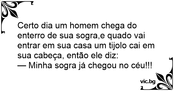 O indivíduo voltando do enterro de sua sogra, passou em frente de um edifício em construção, nisso cai um tijolo em sua cabeça. Exclama o genro : — Já sei porra, chegaste no céu, não precisava me...