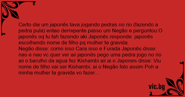 Certo dia um japonês tava jogando pedras no rio (fazendo a pedra pula) entao derrepente passo um Negão e perguntou:O japonês oq tu tah fazendo aki Japonês responde: japonês escolhendo nome de filho pq mulher ta gravida.