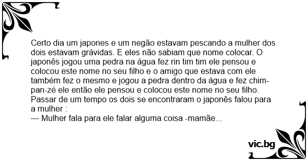 Certo dia um japones e um negão estavam pescando a mulher dos dois estavam grávidas. E eles não sabiam que nome colocar. O japonês jogou uma pedra na água fez rin tim tim ele pensou e colocou este nome no seu filho e o amigo que estava com ele também fez o mesmo e jogou a pedra dentro da água e fez chim-pan-zé ele então ele pensou e colocou este nome no seu filho.
