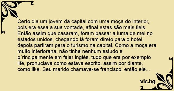 Certo dia um jovem da capital com uma moça do interior, pois era essa a sua vontade, afinal estas são mais fieis. Então assim que casaram, foram passar a luma de mel no estados unidos, chegando lá foram direto para o hotel, depois partiram para o turismo na capital. Como a moça era muito interiorana, não tinha nenhum estudo e p´rincipalmente em falar inglês, tudo que era por exemplo life, pronuciava como estava escrito, assim por diante, como like. Seu marido chamava-se francisco, então ele sempre a corrigia ensinando a pronunciar corretamente dizendo que like pronuciava-se laike, sempre a corrigindo, passearam o dia todo no finalzinho da tarde retornaram ao hotel, lá certas horas da noite ela sentiu vontade de fazer xixi, então ela o chamou, francaisco trais o painaico que quero fazer xaixai.
