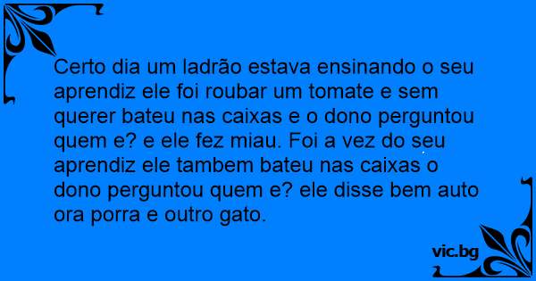 Certo dia um ladrão estava ensinando o seu aprendiz ele foi roubar um tomate e sem querer bateu nas caixas e o dono perguntou quem e? e ele fez miau. Foi a vez do seu aprendiz ele tambem bateu nas caixas o dono perguntou quem e? ele disse bem auto ora роrrа e outro gato.