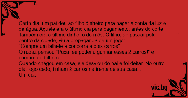 Certo dia, um pai deu ao filho dinheiro para pagar a conta da luz e da água. Aquele era o último dia para pagamento, antes do corte. Também era o último dinheiro do mês. O filho, ao passar pelo centro da cidade, viu a propaganda de um jogo: