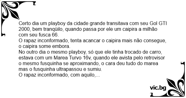 Certo dia um рlаyвоy da cidade grande transitava com seu Gol GTI 2000, bem tranqüilo, quando passa por ele um caipira a milhão com seu fusca 66.