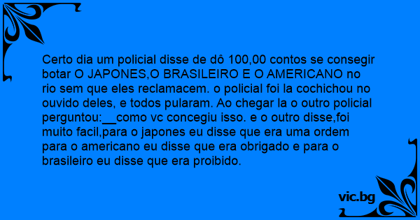 Certo dia um policial disse de dô 100,00 contos se consegir botar O JAPONES,O BRASILEIRO E O AMERICANO no rio sem que eles reclamacem. o policial foi la cochichou no ouvido deles, e todos pularam. Ao chegar la o outro policial perguntou:__como vc concegiu isso. e o outro disse,foi muito facil,para o japones eu disse que era uma ordem para o americano eu disse que era obrigado e para o brasileiro eu disse que era proibido.
