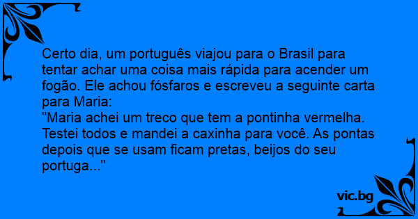Certo dia, um português viajou para o Brasil para tentar achar uma coisa mais rápida para acender um fogão. Ele achou fósfaros e escreveu a seguinte carta para Maria: