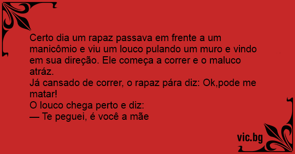 Certo dia um rapaz passava em frente a um manicômio e viu um louco pulando um muro e vindo em sua direção. Ele começa a correr e o maluco atráz.