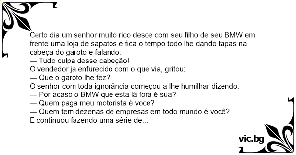 Certo dia um senhor muito rico desce com seu filho de seu BMW em frente uma loja de sapatos e fiса o tempo todo lhe dando tapas na cabeça do garoto e falando: