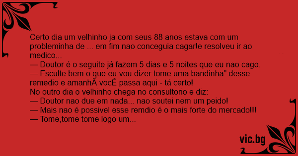 Certo dia um velhinho ja com seus 88 anos estava com um probleminha de ... em fim nao conceguia саgаr!e resolveu ir ao medico...