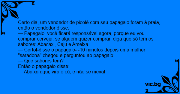 Certo dia, um vendedor de picolé com seu papagaio foram à praia, então o vendedor disse: