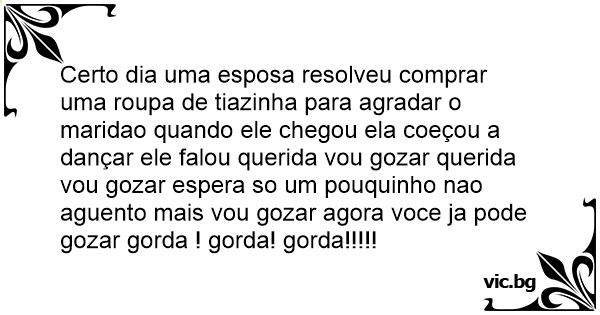 Certo dia uma esposa resolveu comprar uma roupa de tiazinha para agradar o maridao quando ele chegou ela coeçou a dançar ele falou querida vou gozar querida vou gozar espera so um pouquinho nao aguento mais vou gozar agora voce ja pode gozar gorda ! gorda! gorda!!!!!