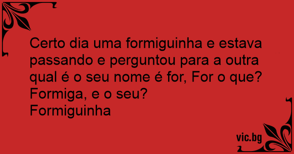Certo dia uma formiguinha e estava passando e perguntou para a outra qual é o seu nome é for, For o que?