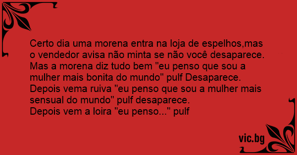 Certo dia uma morena entra na loja de espelhos,mas o vendedor avisa não minta se não você desaparece. Mas a morena diz tudo bem "eu penso que sou a mulher mais bonita do mundo" pulf Desaparece.