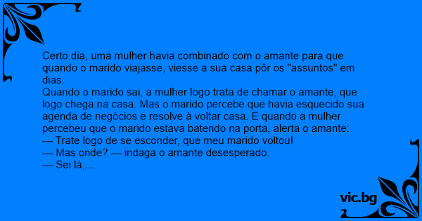 Certo dia, uma mulher havia combinado com o amante para que quando o marido viajasse, viesse a sua casa pôr os "assuntos" em dias.