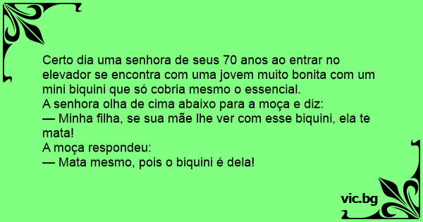 Certo dia uma senhora de seus 70 anos ao entrar no elevador se encontra com uma jovem muito bonita com um mini biquini que só cobria mesmo o essencial.