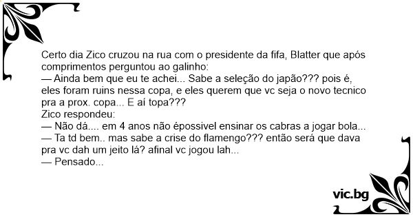 Certo dia Zico cruzou na rua com o presidente da fifa, Blatter que após comprimentos perguntou ao galinho: