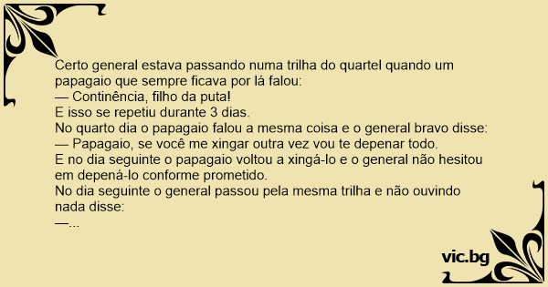 E no dia seguinte o papagaio voltou a xingá-lo e o general não hesitou em depená-lo conforme prometido.