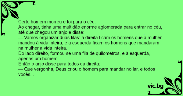 Ao chegar, tinha uma multidão enorme aglomerada para entrar no céu, até que chegou um anjo e disse: