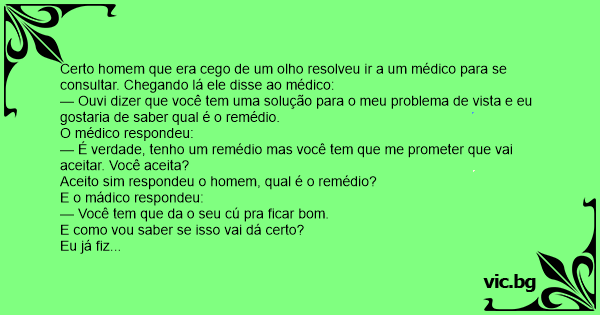 Certo homem que era cego de um olho resolveu ir a um médico para se consultar. Chegando lá ele disse ao médico: