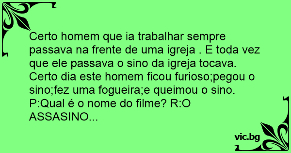 Certo homem que ia trabalhar sempre passava na frente de uma igreja . E toda vez que ele passava o sino da igreja tocava. Certo dia este homem ficou furioso;pegou o sino;fez uma fogueira;e queimou o sino. P:Qual é o nome do filme? R:O ASSASINO...