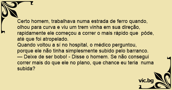 Certo homem, trabalhava numa estrada de ferro quando, olhou para curva e viu um trem vinha em sua direção, rapidamente ele começou a correr o mais rápido que pôde, até que foi atropelado.