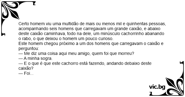 Certo homem viu uma multidão de mais ou menos mil e quinhentas pessoas, acompanhando seis homens que carregavam um grande caixão, e abaixo deste caixão caminhava, todo na dele, um minúsculo cachorrinho abanando o rаво, o que deixou o homem um pouco curioso.