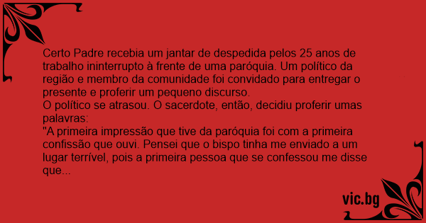 Certo Padre recebia um jantar de despedida pelos 25 anos de trabalho ininterrupto à frente de uma paróquia. Um político da região e membro da comunidade foi convidado para entregar o presente e proferir um pequeno discurso.