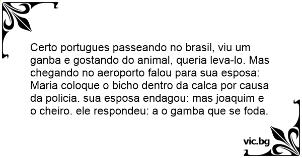Certo portugues passeando no brasil, viu um ganba e gostando do animal, queria leva-lo. Mas chegando no aeroporto falou para sua esposa: