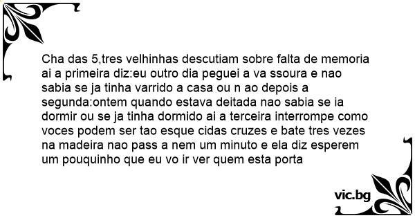 Cha das 5,tres velhinhas descutiam sobre falta de memoria ai a primeira diz:eu outro dia peguei a va ssoura e nao sabia se ja tinha varrido a casa ou n ao depois a segunda:ontem quando estava deitada nao sabia se ia dormir ou se ja tinha dormido ai a terceira interrompe como voces podem ser tao esque cidas cruzes e bate tres vezes na madeira nao pass a nem um minuto e ela diz esperem um pouquinho que eu vo ir ver quem esta porta
