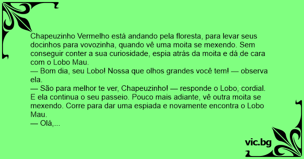 — São para melhor sentir o seu perfume, Chapeuzinho! — responde ele, secamente.