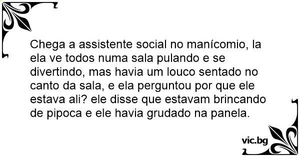 Chega a assistente social no manícomio, la ela ve todos numa sala pulando e se divertindo, mas havia um louco sentado no canto da sala, e ela perguntou por que ele estava ali? ele disse que estavam brincando de pipoca e ele havia grudado na panela.