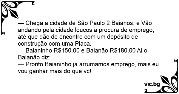 — Pronto Baianinho já arrumamos emprego, mais eu vou ganhar mais do que vc!