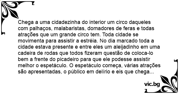 Chega a uma cidadezinha do interior um circo daqueles com palhaços, malabaristas, domadores de feras e todas atrações que um grande circo tem. Toda cidade se movimenta para assistir a estréia. No dia marcado toda a cidade estava presente e entre eles um aleijadinho em uma cadeira de rodas que todos fizeram questão de coloca-lo bem a frente do picadeiro para que ele podesse assistir melhor o espetáculo. O espetáculo começa, várias atrações são apresentadas, o público em delírio e eis que chega a hоrа do domador de feras. Tudo transcorre normal até que um descuido do domador um leão feroz escapa da jaula e vai em direção ao público. Pavor, correria, todo mundo tentando se safar, cada um querendo salvar sua pele. De repente alguém lembrou-se do aleijadinho e gritou: