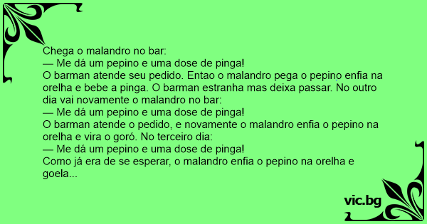 O barman atende seu pedido. Entao o malandro pega o pepino enfia na orelha e bebe a pinga. O barman estranha mas deixa passar. No outro dia vai novamente o malandro no bar: