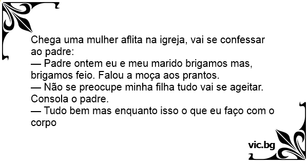 Chega uma mulher aflita na igreja, vai se confessar ao padre: