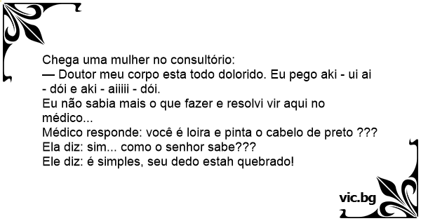 Uma loira que pintou o cabelo de ruivo vai no médico, chegando la ela pergunta!! — Doutor esses ultimos dias da semana tenho sentido dor em todas as partes do corpo, em toda parte que toco sinto...