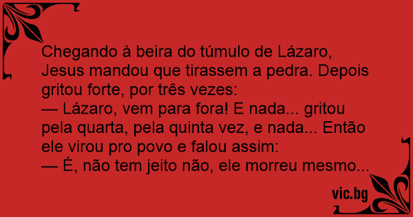 — Lázaro, vem para fora! E nada... gritou pela quarta, pela quinta vez, e nada... Então ele virou pro povo e falou assim: