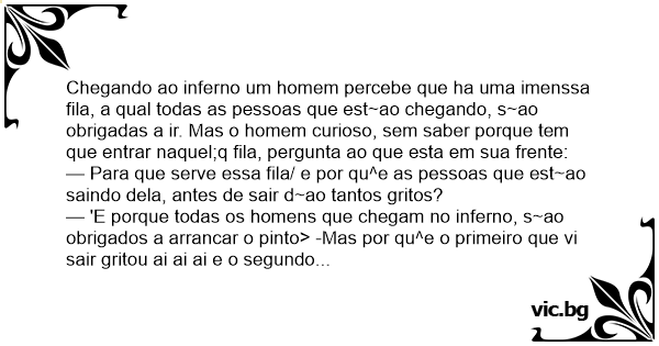Chegando ao inferno um homem percebe que ha uma imenssa fila, a qual todas as pessoas que est~ao chegando, s~ao obrigadas a ir. Mas o homem curioso, sem saber porque tem que entrar naquel;q fila, pergunta ao que esta em sua frente: