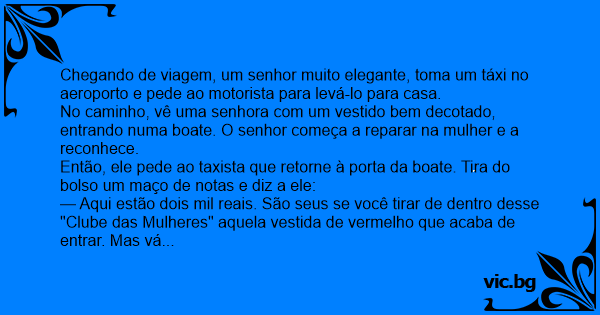 — Aqui estão dois mil reais. São seus se você tirar de dentro desse "Clube das Mulheres" aquela vestida de vermelho que acaba de entrar. Mas vá tirando e cobrindo de pancadas, sem pena, porque aquela desgraçada é minha esposa.