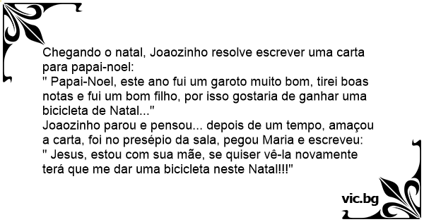 " Jesus, estou com sua mãe, se quiser vê-la novamente terá que me dar uma bicicleta neste Natal!!!"