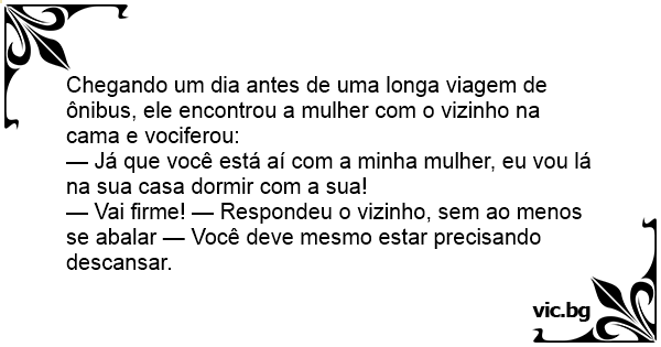 Chegando um dia antes de uma longa viagem de ônibus, ele encontrou a mulher com o vizinho na cama e vociferou: