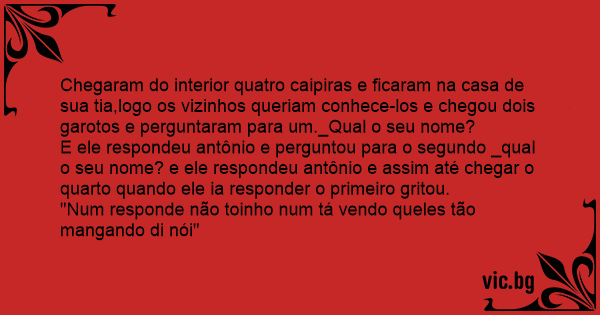 Chegaram do interior quatro caipiras e ficaram na casa de sua tia,logo os vizinhos queriam conhece-los e chegou dois garotos e perguntaram para um._Qual o seu nome?