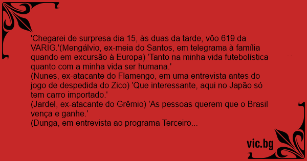 'Chegarei de surpresa dia 15, às duas da tarde, vôo 619 da VARIG.'(Mengálvio, ex-meia do Santos, em telegrama à família quando em excursão à Europa) 'Tanto na minha vida futebolística quanto com a minha vida ser humana.'