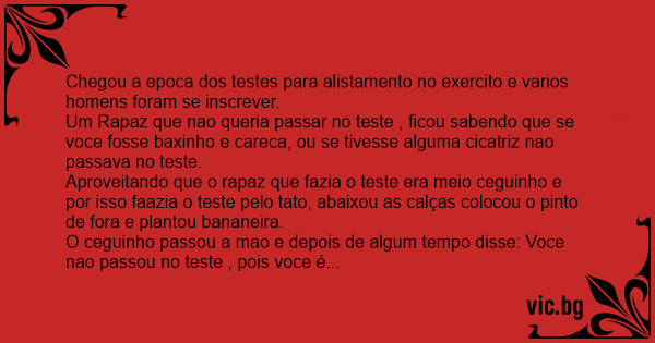 Aproveitando que o rapaz que fazia o теsте era meio ceguinho e por isso faazia o теsте pelo tato, abaixou as calças colocou o pinto de fora e plantou bananeira.