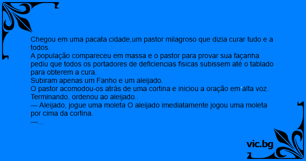 O aleijado jogou a outra moleta por cima da cortina e o povo exclamou e encheram de o milgraso pastor de aplausos.