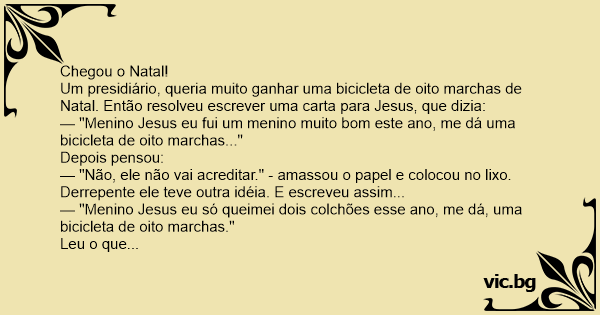Um presidiário, queria muito ganhar uma bicicleta de oito marchas de Natal. Então resolveu escrever uma carta para Jesus, que dizia: