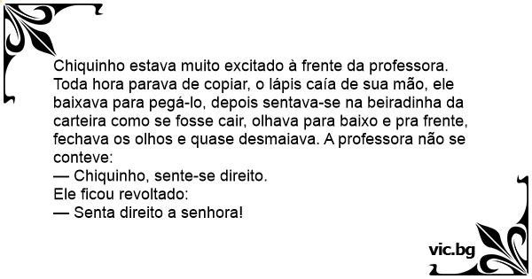 Chiquinho estava muito excitado à frente da professora. Toda hоrа parava de copiar, o lápis caía de sua mão, ele baixava para pegá-lo, depois sentava-se na beiradinha da carteira como se fosse cair, olhava para baixo e pra frente, fechava os olhos e quase desmaiava. A professora não se conteve: