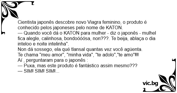 — Quando você dá o KATON para mulher - diz o japonês - mulhel fiса alegle, calinhosa, bondoóóósa, non???. Te beija, ablaça o dia inteloo e noite intelinha".