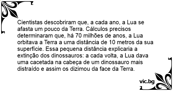 Cientistas descobriram que, a cada ano, a Lua se afasta um pouco da Terra. Cálculos precisos determinaram que, há 70 milhões de anos, a Lua orbitava a Terra a uma distância de 10 metros da sua superfície. Essa pequena distância explicaria a extinção dos dinossauros: a cada volta, a Lua dava uma cacetada na cabeça de um dinossauro mais distraído e assim os dizimou da face da Terra.